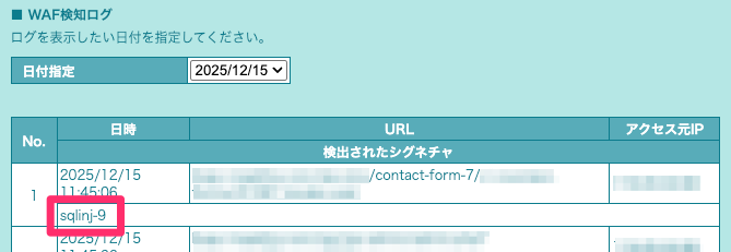 WAFが検知したログが表示されるので、除外したいシグネチャ(今回はContact Form 7)をコピーします。(事前にエラーを発生させておいて特定します)