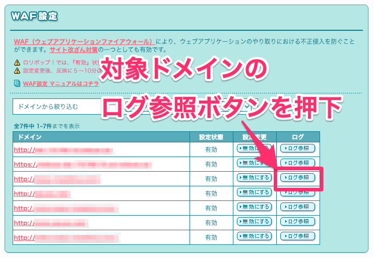 ロリポップマイページにログインし、セキュリティ>WAF設定 から対象ドメインの「ログ参照」ボタンを押下します。