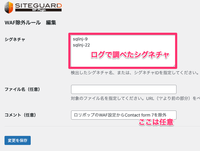 先ほどログで確認したシグネチャを貼り付けて保存ボタンを押下します。シグネチャが複数ある場合は、改行で区切って登録します。