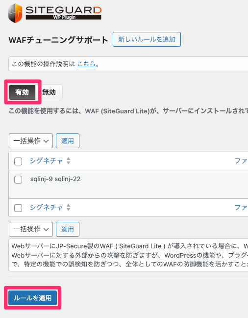 WAFチューニングサポートを有効にしてルールを適用ボタンを押下し、設定完了です。